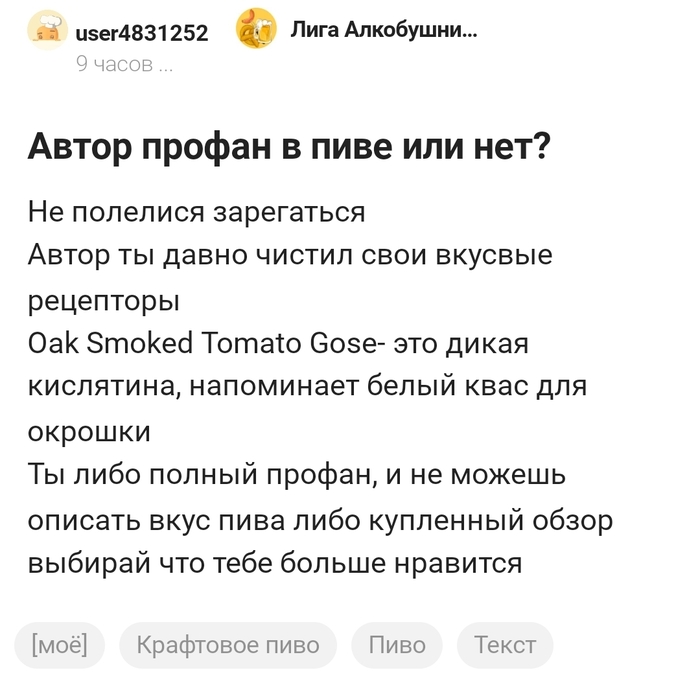 Опустим момент с отсутствием запятых, логики, пробелов, здравого смысла и точек. Опечатки тоже оставим в стороне. Ещё, конечно, меня удивило, что многие в комментариях начали искать "козла отпущения", то есть, оригинальный обзорный текст, на который ссылается user4831252. И пикабушник (или пикабушница) @rryba смог найти, вероятно, единственный пост с Oak Smoked Tomato Gose (далее — OSTG), который делал я аж 8 апреля 2022 года. Это был второй выпуск "Томатных Оборзений". Что ж, разберём вышеприведённый пост на детали и пройдёмся по претензиям.