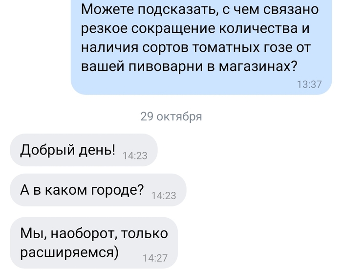 Не поймите меня неправильно, я уважаю любой честный труд. И прекрасно понимаю, что есть некие негласные производственные правила или рекомендации, которые надо соблюдать, чтобы тебя не выперли взашей с рабочего места. Но вся эта переписка с представителем пивоварни, который пытался делать хорошую мину при плохой обстановке, выглядела каким-то сюрреалистичным и лицемерным цирком.