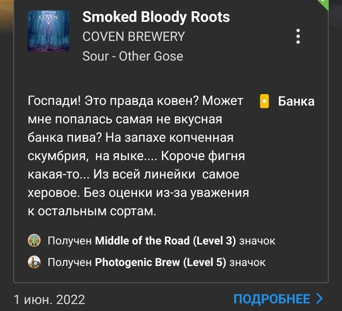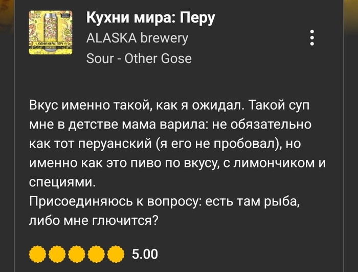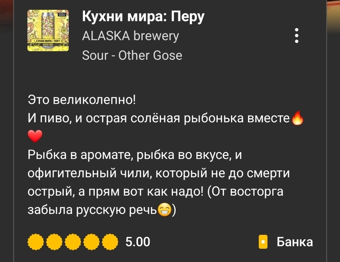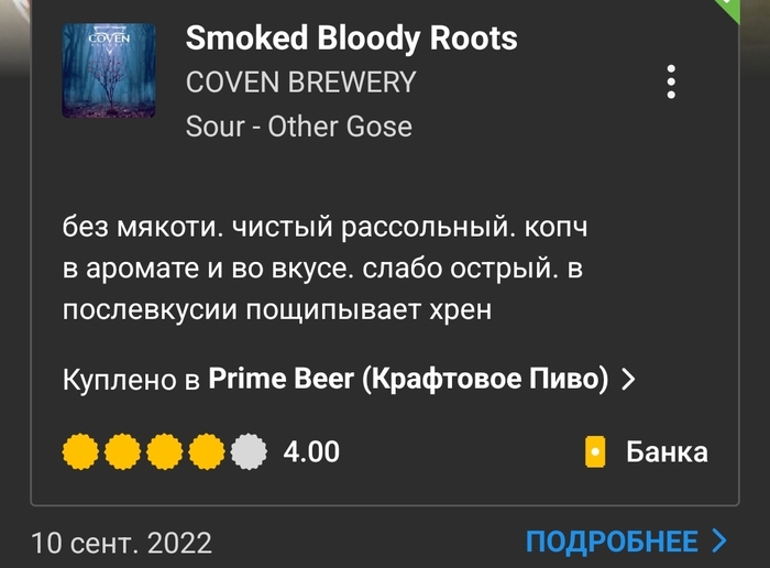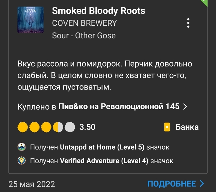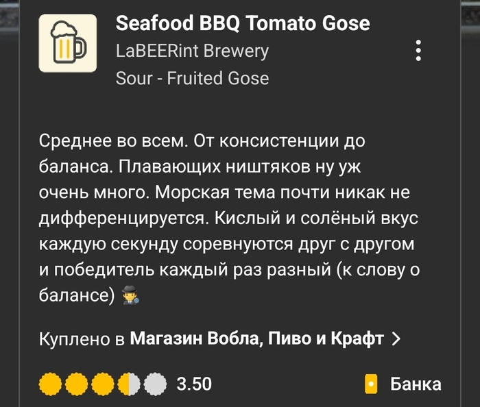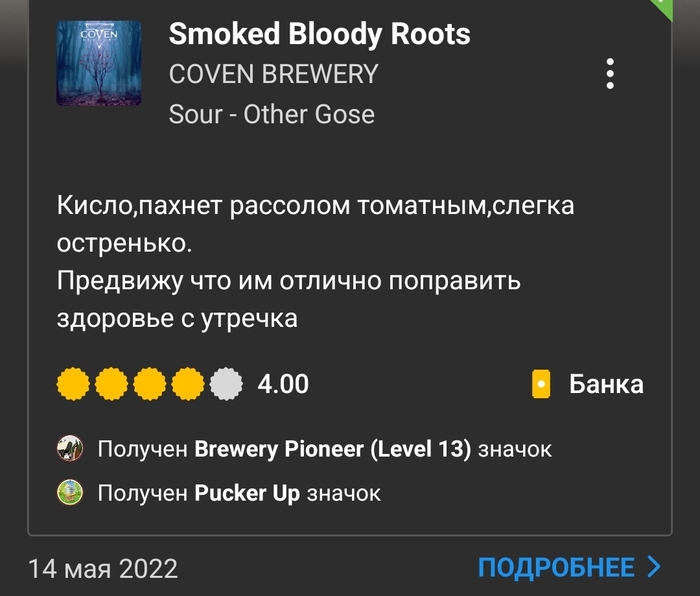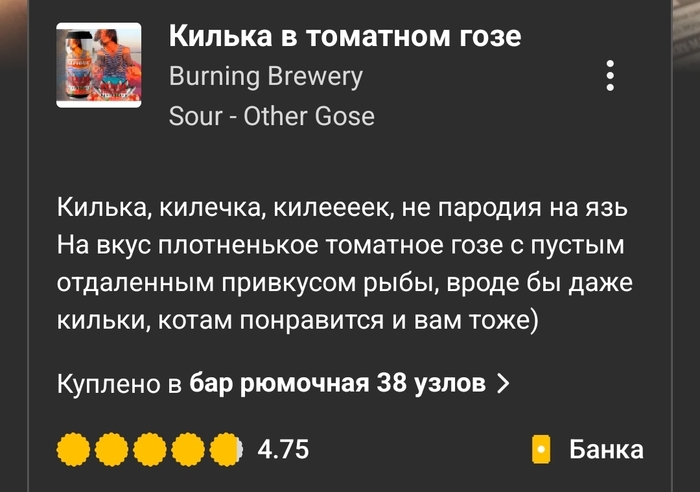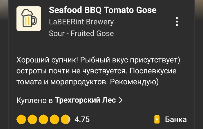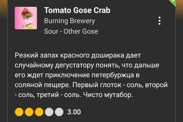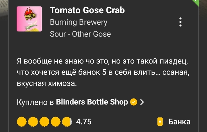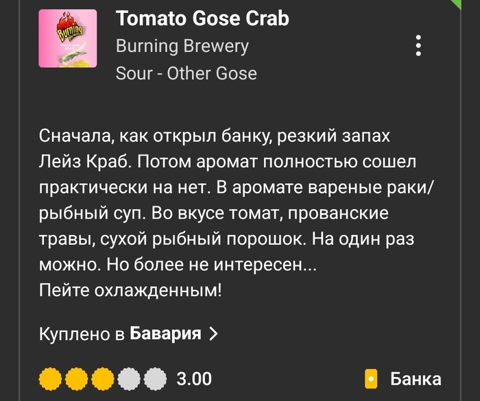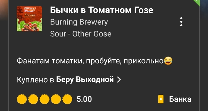 Вердикт: питкий и приятный гозе с насыщенными томатными, чесночными, пряными и копчёными оттенками. Острота в меру.