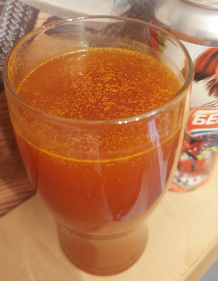 Вкус. По сути, напиток представляет собой разбавленный томатный сок средней густоты. Что-то наподобие "Доброго", в который добавили воды, чтобы вы понимали. Однако, томатного вкуса у напитка нет. Либо сок был не самый лучший, либо добавили слишком много H²O, которая вымыла всю помидорность. Единственное, что ощущается — небольшая кислинка, которая считывается исключительно(!) губами. То есть, сосочки на языке просто "наслаждаются" безвкусной жидкостью.