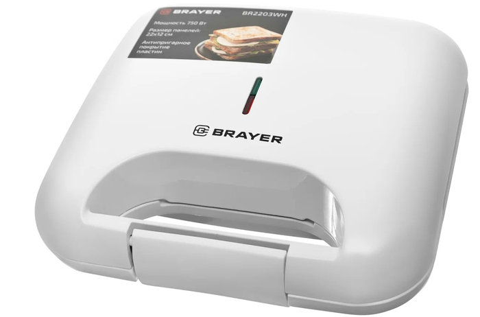 Модель BRAYER BR2203WH представляет собой компактное решение для быстрого приготовления сэндвичей в условиях ограниченного кухонного пространства. Её лаконичный белый корпус с серебристыми акцентами органично впишется в современный интерьер. Аппарат демонстрирует стабильную работу благодаря продуманной системе терморегуляции, равномерно прогревая обе панели.