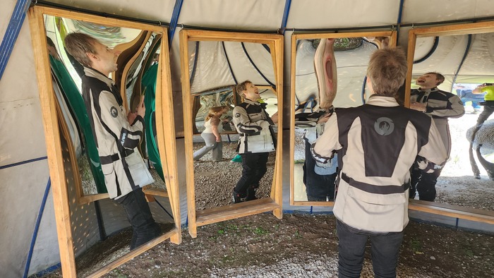 Не уверен, что вы найдёте хоть что-то в следующем году, хотя дом с соломенной крышей пережил, получается, уже 2 зимы заброшенным. И фото у меня осталось только общего вида, показывающего нашу разношёрстную компанию из круизёра (кажется Yamaha Drag Star), Yamaha Niken, Honda F6B, Honda NC700 и вашего покорного слуги на BMW R1200GSA.