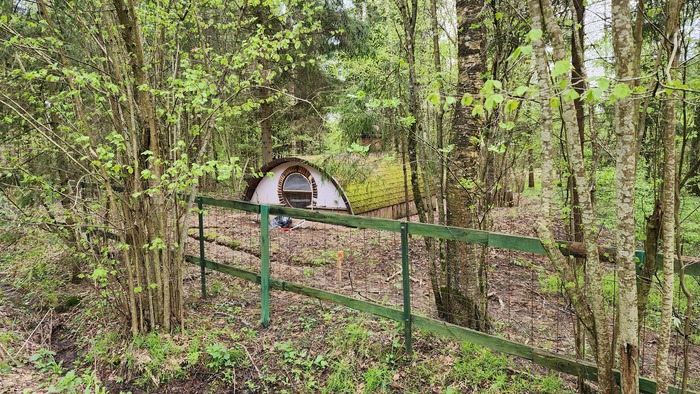 Наверно, нам стоило бы заглянуть в заброшенную больницу Хотьково, но мы едем смотреть, что осталось от реконструкции деревни ( 56.231133, 38.061573 ), читатели подсказывают что это бывший Этнопарк. Я был там несколько лет назад и тогда там стояли дома, соблюдался быт и ремёсла прошлого. Сейчас всё это заросло, посерело, покосилось, дома вообще, похоже, забрали целиком.