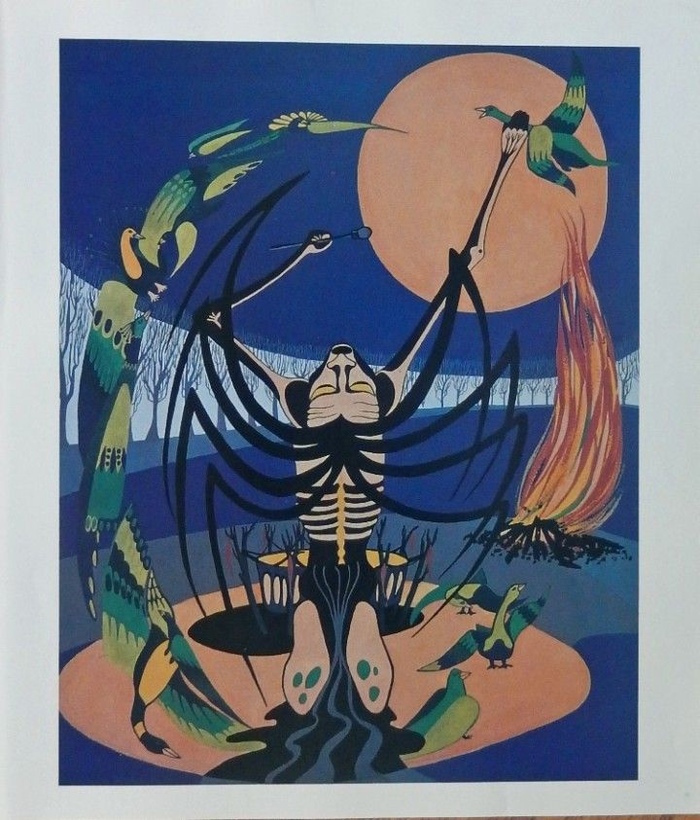 Когда Иктоми вернулся на то место, где он оставил оленя, то обнаружил, что туша исчезла—исчезла, исчезла! Осталась только груда сухих костей. Не было ни следов, ни каких-либо признаков того, что кто-то утащил оленя. Судя по всему туша была превращена в сухие кости с помощью мощной магии.