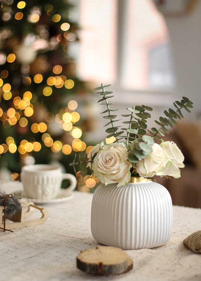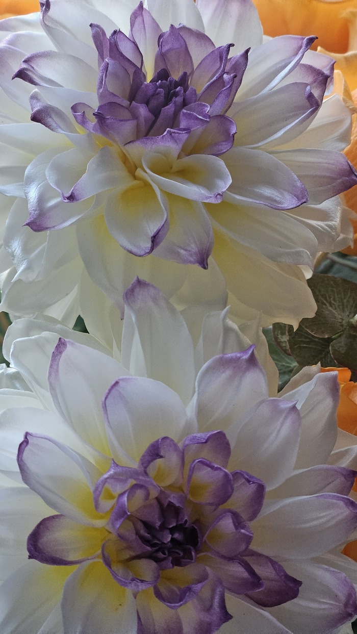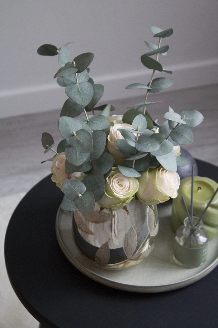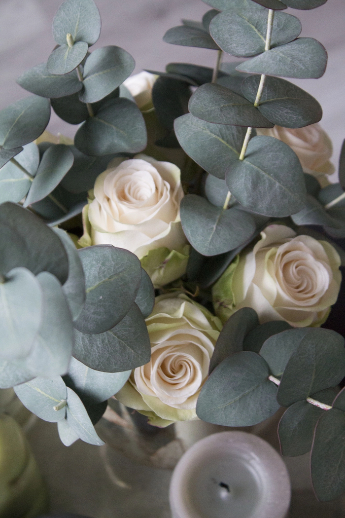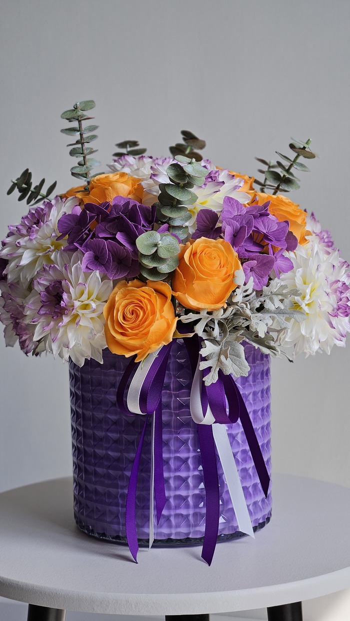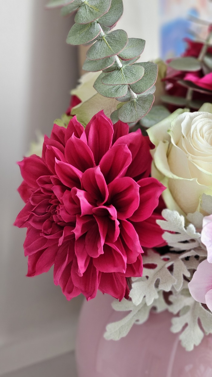Георгины, розы, гортензия, эвкалипт, цинерария.