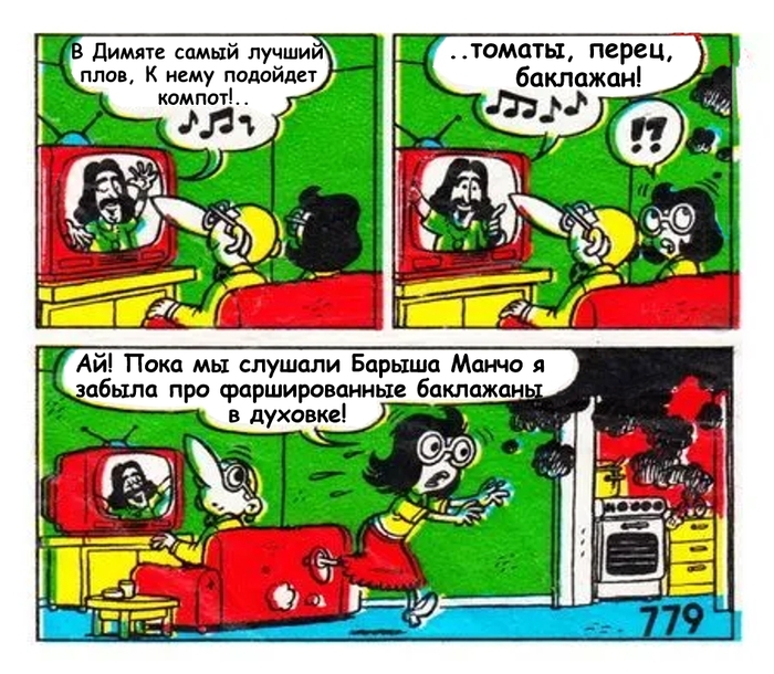 Еще одно блюдо из запеченных баклажанов упоминается в следующем вкладыше. Подруга Типитипа засмотрелась на популярного в 70-е турецкого певца Барыша Манчо и совсем забыла про фаршированные баклажаны в духовке. Это блюдо называется "Карныярык" (дословно - распоротый живот).