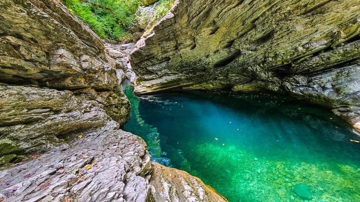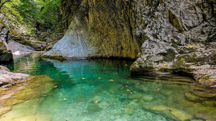 идти можно как по оборудованной тропе,так и прям по руслу. НО! По малой воде некоторые заводи были от 2 м глубиной. Так что учитывайте это.