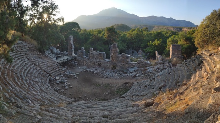 4. Фасе́лис - скромные античные развалины, зато прямо на берегу моря и среди сосновых деревьев 36.523384, 30.552224. Касса находится на автодороге 36.530104, 30.541369 (50TL) и легко обходится по лесной тропе со стартом отсюда 36.531254, 30.55362. Рядом красивейший грот в береговом обрыве с плоским полом, идеальный для ночёвки с палаткой 36.530988, 30.556344, в чём мы убедились лично!
