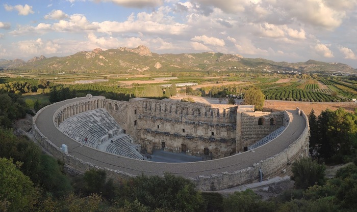 3. Аспе́ндос - полис на вершине скалистого холма, широко известным своим роскошным амфитеатром 36.938969, 31.172194. Вход 36.939353, 31.172763 цена 100TL. Рекомендуется обходить по дороге под обрывами с запада до впечатляющих развалин акведука 36.944046, 31.168139 бесплатно. Далее через дырку в заборе 36.945116, 31.170399 наверх на полянку 36.943873, 31.170198 где даже можно стать с палаткой (но без воды). Заканчивайте осмотр амфитеатром.