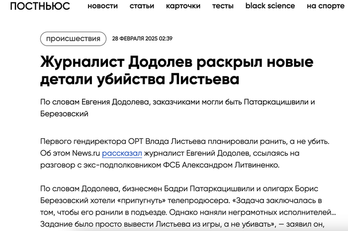 1 марта 1998 года. Исполнительный секретарь СНГ Борис Березовский обвинил в причастности к организации убийства Листьева бывших руководителей ФСБ РФ и Службы безопасности Президента Михаила Барсукова и Александра Коржакова. По утверждению Березовского, российские спецслужбы сами организовали убийство Листьева, а затем попытались свалить на него совершение данного преступления.