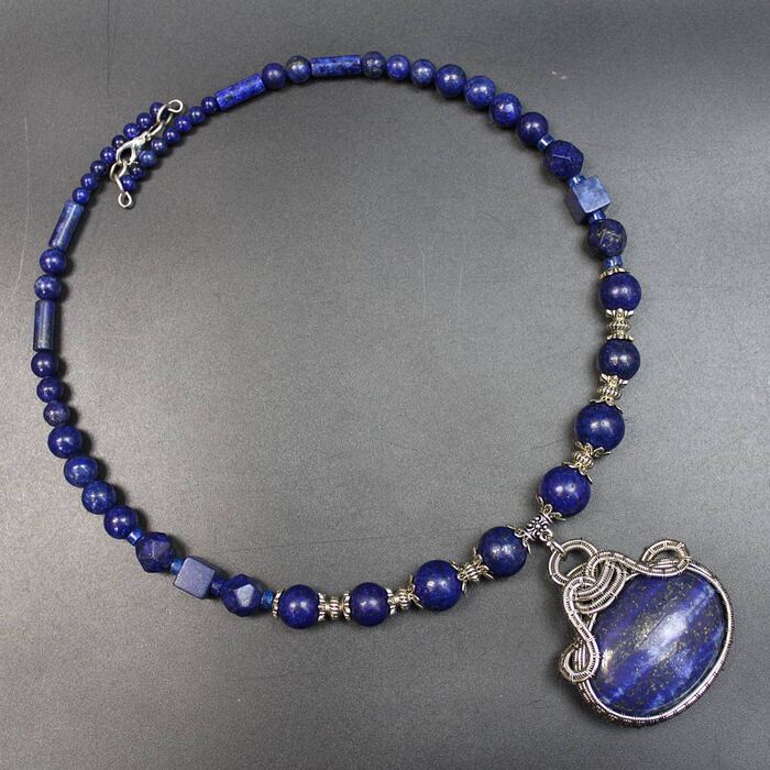 Ожерелье ручной работы из натурального лазурита с авторским кулоном из проволоки и кабошона из камня.