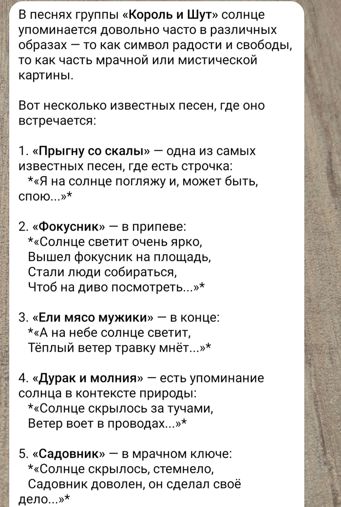 Неожиданные ответы на вопрос "В какой песне группы Король и Шут упоминается солнце?"