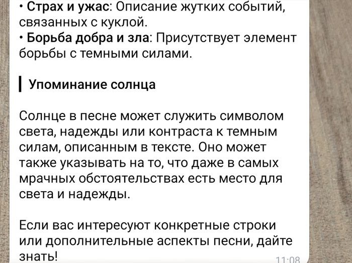 ЧатЖПТ 5 мини указал на Куклу Колдуна, предложил конкретизировать, но тут же сказал, что не может цитировать строки, только пересказать.