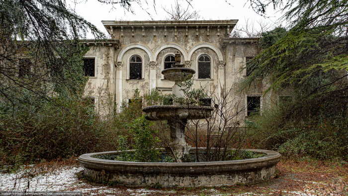 Первое здание на моём пути — лечебный корпус. Внутри заброшенного здания обвалились перекрытия и теперь от него остался только фасад и заросший, почерневший от времени фонтан около главного входа.
