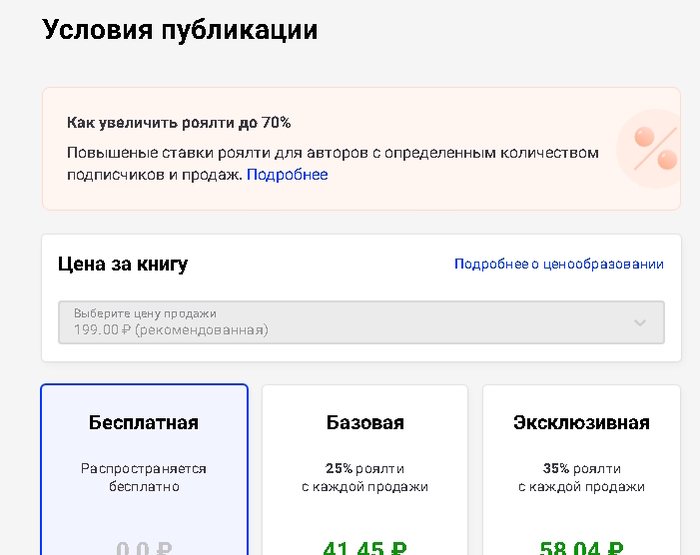 3 Условия публикации - тут есть 3 варианта: бесплатно, базовая 25% роялити и эксклюзивная 35% роялити. Мной первый раз был выбран вариант с 35%. Логику этого выбора я описывал в самом начале.