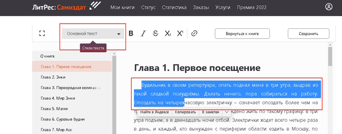 Файл книги - это целая эпопея. У ЛитРеса особенные требования. Главы, заголовки и прочая ересь, которая для меня была проблемой номер один. Я несколько раз подгонял файл. В итоге сделать файл, как необходимо в требованиях я так и не смог, но не расстраивайтесь! Оказалось не так страшен черт, как его малюют! Оказалось, что гораздо удобнее загрузив один раз файл вносить нужные правки уже во встроенном редакторе. Там это проще и более наглядно устроено. Поэтому не ломайте голову, как подогнать весь файл, грузите и редактируйте уже внутри литрес. На сайте указано, что модерация может идти до 7 дней, но в реальности она проходит быстрее. У меня максимум были сутки первый раз. Скорее всего зависит от объема книги.