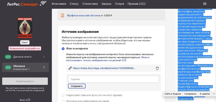 Пожалуйста, подтвердите ваше право на использование этой иллюстрации/обложки: — укажите такую ссылку на источник, которая подтвердит лицензию распространения (это могут быть платные или бесплатные фотостоки, по лицензии Creative Commons СС0). — если вы заказали иллюстрацию или договорились с художником/фотографом, загрузите надежный документ с разрешением на публикацию изображения (подойдут скриншоты переписки с согласием художника и указанием названия произведения, чеки оплаты, письменное подтверждение автора иллюстрации). — если вы сами создали эту иллюстрацию, укажите себя в качестве художника в карточке книги. Обратите внимание: вы можете воспользоваться стоковыми платными и/или бесплатными иллюстрациями. Помните, что профессиональные агрегаторы портфолио типа behance.net, а также социальные сети, Pinterest.com, Google.Картинки, Яндекс.Картинки не являются стоком. Всегда проверяйте лицензию изображения. В Вашей ссылке ничего о лицензии нет.