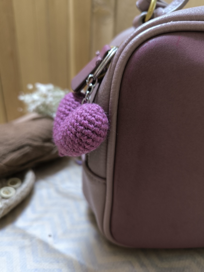В работе гипоаллергенный акрил и качественная фурнитура. Связан крючком, бесшовная текстура. Вяжется достаточно быстро, если конечно знать как и может получиться очень милый аксессуар, в тон вашей сумочке. Наполнитель холофайбер, как в игрушках амигуруми.