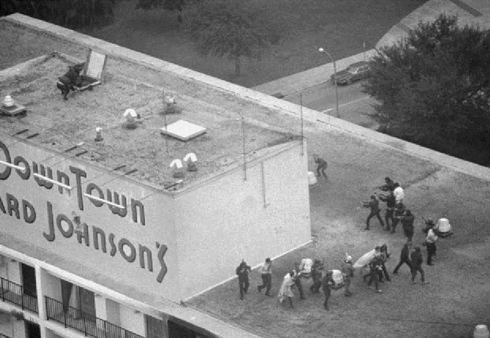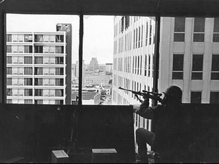 Начиная с 02:00, по меньшей мере, пять сотрудников полиции сообщили о выстрелах и голосах на крыше. По их словам, неизвестный стрелял с крыши строения, где находились бойлерная и лифтовые механизмы; при этом один из пятерых настаивал, что ясно видит в бинокль снайпера, расположившегося в районе буквы «Т» (в слове DownTown) и взялся корректировать огонь. Опять началась стрельба с соседних зданий; к ней присоединились (как того и опасался Кларенс Джиаруссо) те из полицейских, у кого не было рации. Некоторым из них почудилось движение на верхних этажах отеля- и они немедленно обстреляли собственных коллег на этих самых этажах. Один из офицеров, оказавшихся под огнем, в ярости схватил радиостанцию и заорал, что если по ним сделают еще один выстрел- то они «начнут стрелять в этих идиотов в ответ»...
