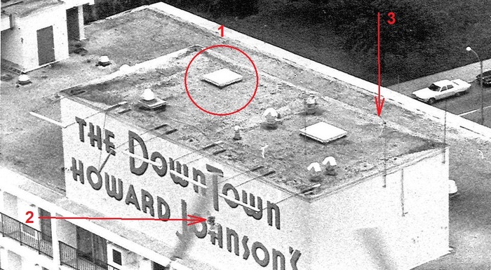 Центральная пристройка на крыше отеля. 1- люк из помещения с лифтовыми механизмами, из которого вылез офицер Уолтер Рид; 2- разбитое вентиляционное отверстие, через которое внутрь бойлерной были запущены гранаты со слезоточивым газом; 3- примерно в этом месте находилась дверь в бойлерную.