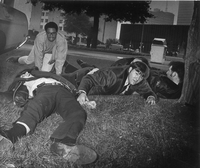 «Когда он выбежал из пристройки во второй раз, все мы начали стрелять», - вспоминал детектив Гас Кринке. «Некоторые вышибли фанерные щиты (закрывавшие окна в ранее сгоревшем «Раулт Центре», напротив отеля), чтобы получше его разглядеть. Невозможно сказать, сколько раз в него попали. Сам я только что вставил новый магазин, и когда он вышел, я прицелился и опустошил его. Парни кричали: «Да, теперь мы тебя поймали, сукин ты сын! Умри, чертов ублюдок! Умри!». Мы почувствовали облегчение. Впервые после того, как были убиты все эти копы, у нас появился шанс что-то сделать, дать отпор. Когда он упал, раздались радостные крики».