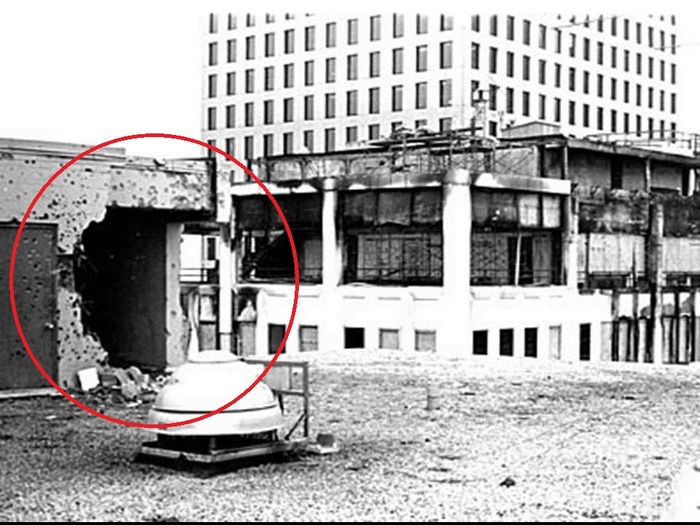 Взлетая, Чак попросил не открывать огня при первом облете отеля- необходимо было провести, что называется, «доразведку». Однако, когда вертолет завершал этот самый первый круг, кто- то крикнул, что по машине стреляют. На втором или третьем заходе с вертолета открыли ответный огонь- не только по отсекам сбоку от выхода на лестничную клетку, но и по самому выходу. Пули патронов 5.56х45 мм прошивали дверь насквозь, и те из полицейских, кто расположился на лестничной площадке, на несколько маршей ниже двери, оказались засыпаны осколками бетона и штукатурки- и просто удивительно, что никого не зацепило рикошетом. Далее все повторялось по одному и тому же сценарию- делая очередной круг, CH-46 снижался над крышей, и, когда машина оказывалась напротив «северной» пристройки, офицеры полиции принимались «поливать» её из винтовок, не жалея патронов; когда вертолет отворачивал в сторону, стрелки перезаряжали оружие.