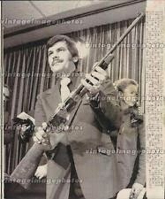 Эксперт Алекс Вега демонстрирует журналистам Ruger Deerslayer Марка Эссекса, детали которого пришлось скреплять между собой липкой лентой, чтобы показать публике.