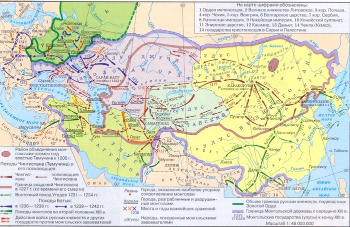 Как видим, поход начался летом 1236 г. и осенью главные силы монголов соединились отрядом Джучи. Это опровергает вздорные выдумки фальсификаторов истории, которые почему-то уверяют своих читателей, что монголы зачем-то ходили в походы зимой и по бесплодным пустыням. На запад ушли войска улуса Джучи, включавшим в себя Забайкалье и часть Заволжья, улуса Чагатая (Средней Азии и Южного Казахстана), улуса Угедея (часть Семиречья и Западная Монголия), основная монгольская армия, которой командовали по обычаю потомки хана Толуя. Это была, пожалуй, самая большая и самая боеспособная армия XIII в.