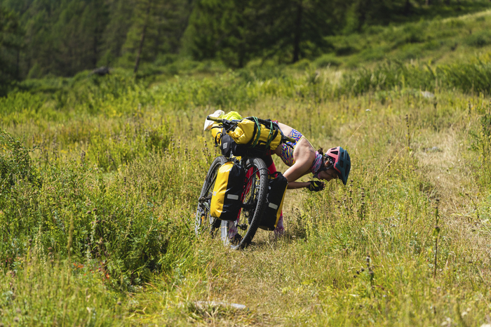 После того как набрали продуктов, предложил девчонкам попробовать поднять хотя бы руль моего велосипеда. Безуспешно. А загрузил я его продуктами максимально, свободного места просто не было, воды только 6 литров.
