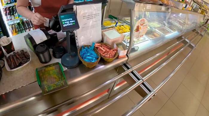 Что касается обеда, то его я решил потребить на заправке. К тому же здесь можно удобно провести прямой эфир, не отходя от розетки. Пока я занимался своими делами, солнце успело опуститься на уровень горизонта и подарить мне прелестный закат.