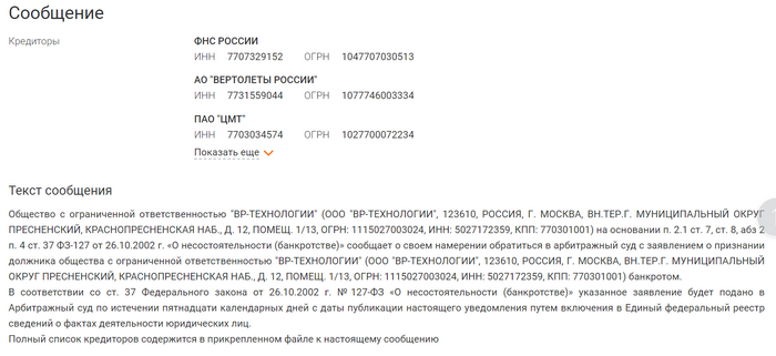 И вот 26 марта 2024-года ООО "ВР-Технологии", занимавшееся разработкой легкого пассажирского вертолета VRT500 и беспилотника вертолетного типа VRT300, разместила на Федресурсе уведомление о подаче заявления в суд о признании себя банкротом.