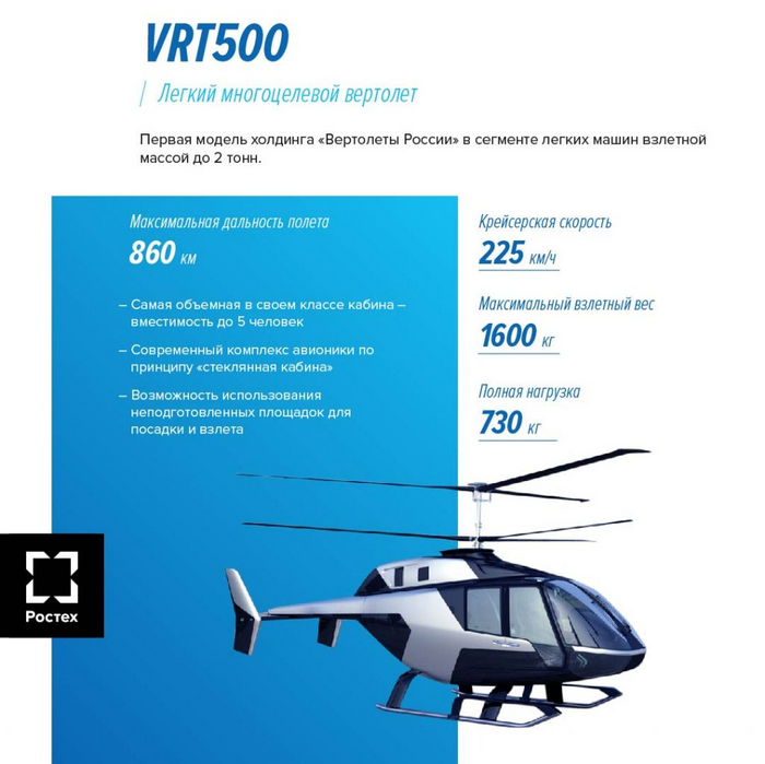 18 июля 2017 года холдинг "Вертолеты России" на салоне "МАКС-2017" впервые представил модель легкого многоцелевого VRT500, разработанного дочерним конструкторским бюро "ВР-Технологии".