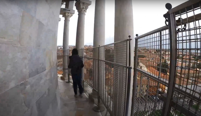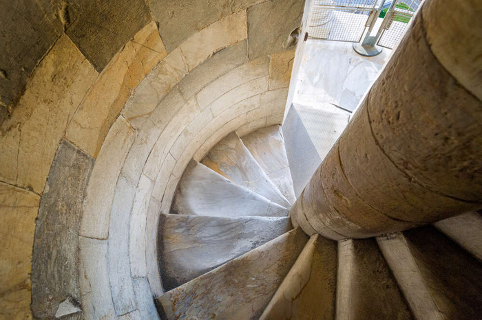 Как уже догадались некоторые читатели, эта лестница как бы опоясывает всё строение. Образно говоря, она похожа на внутреннюю спираль, которая накручена на остов Пизанской башни.