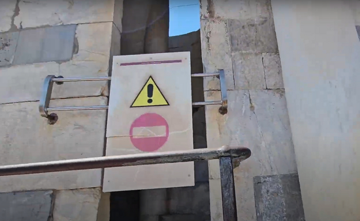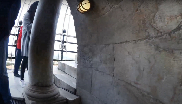 Мы вновь в галерее с колоннами, сеткой и знакомыми видами. Только тут что-то вроде ступенчатого пола. Так что защитное ограждение здесь очень кстати.