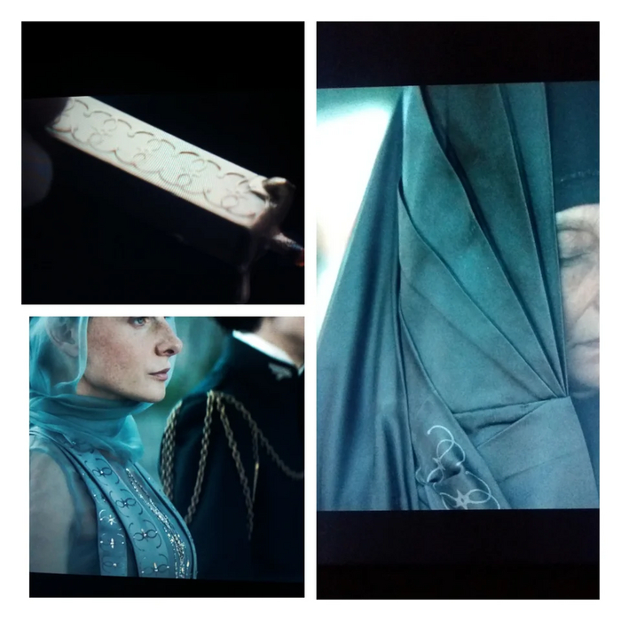 В "Дюне" (2021) во время встречи с представителями высших домов мы видим одинаковый узор на платье леди Джессики, на платье преподобной матери и на сургуче, которым пользуется Бене Гессерит.