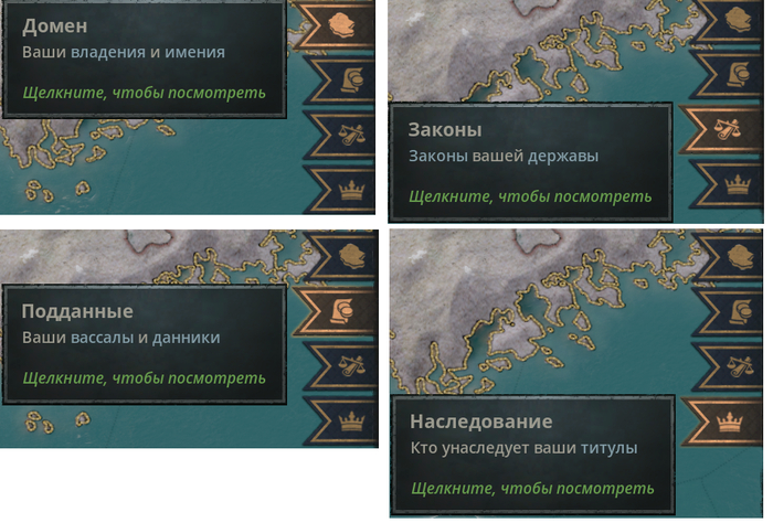 Опытные игроки уже видят кнопки (сверху вниз) Легенды, Культуры, Журавль - кнопка религии, Зелёная кнопка - герб семьи Цинь, далее шкала стресса, далее выбор жизненного пути, инвентарь для артефактов, поместье и четыре новые кнопки