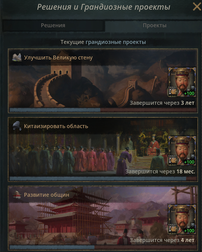 Проекты это улучшения областей, которые объявляет Сын Неба и в котором вы можете принять участие, вложившись Казной Владения. Наведя курсор на квадратик участия, можно увидеть какие плюшки вы получите, вложившись именно в этот квадратик: