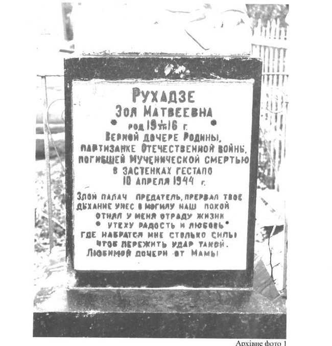 К несчастью, Зоя попалась все-таки врагам. 10 марта 1944 года после взрыва немецкого оружейного склада ее схватило гестапо (государственная тайная полиция). Мучители решили выбить все, что могла знать девушка. Пытали ее ужасно, очень жестоко, требуя выдать фамилии партизан, их планы. Зверски избивали, сломали обе руки, выкололи глаза отрезали нос, вырвали волосы,. Не получив ни одного ответа ни на один вопрос, обезображенное тело, изверги бросили в машину и увезли на окраину города - в Дубки. Зоя Рухадзе была еще жива, когда ее бросили в глубокий колодец. Девушка умерла в ужасающих муках. Боюсь даже представить, что чувствовала эта храбрая, смелая партизанка, которая вытерпела все пытки, не выдав товарищей, чем сберегла их жизни.
