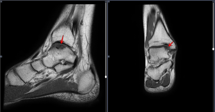 По заднему контуру таранной кости визуализируется добавочная кость- os trigonum размером 1.1х1.5см,наиболее вероятно вызывающая импиджмент-синдром заднего отдела голеностопного сустава.