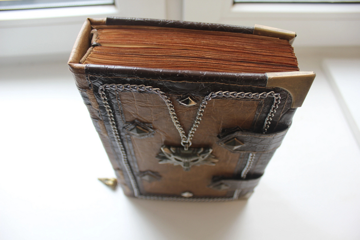 Поскольку я планировала сделать максимально тяжелую и внушительную книженцию, то внутри в наполнении оставила очень много пустых страниц (между описаниями, а всего стр +-450), а также в качестве подложки для обложки использовала кусок утепленного линолиума (это была очень большая ошибка). А еще из-за того, что я не дружила со швейной машинкой пришлось все прострачивать вручную. Не будем забывать, что все страницы я состаривала в кофе и делала этот процесс максимально трудоемким. А когда 2ой день подряд ничего толком не сохло, то в ход пошел фен (тут я с ним и распрощалась, т.к. он сгорел и больше не дул горячим воздухом). В последующих работах процесс был оптимизирован и изменен сам подход к состариванию при том, что результат оставался прежним, а сушка занимала несколько часов.