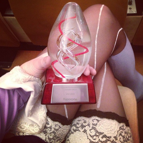 В рамках КРИ 2013 (которая оказалась последней до номинального объединения с Игромиром) у нас был свой стенд, где мы презентовали игру журналистам и коллегам из других компаний. Там же выиграли награду в номинации по нашему жанру. Я ее уже показывала в другом посте ранее, но не могу не поделиться этим чудесным призом еще раз.