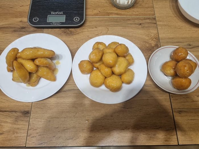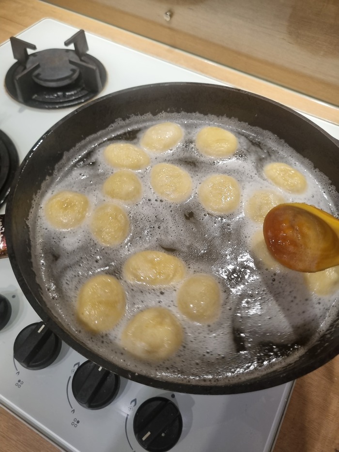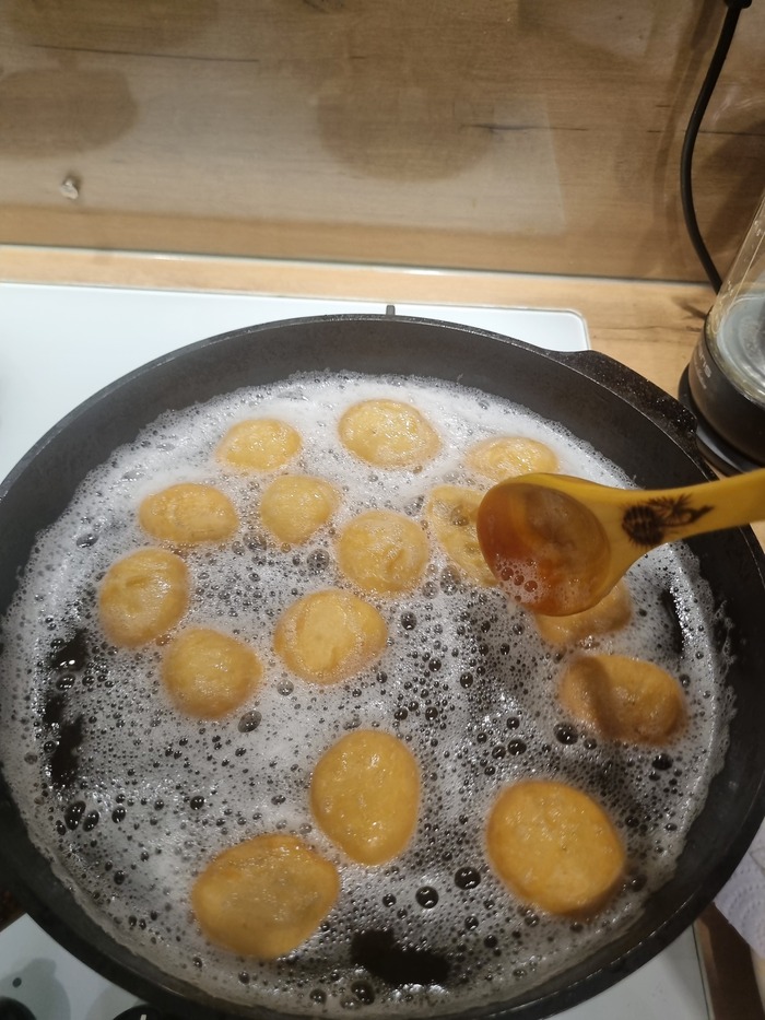 Следующая партия и масло я не остужал. Закидываю шарики и добавляю огонь до среднего на самой маленькой конфорке.