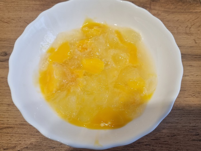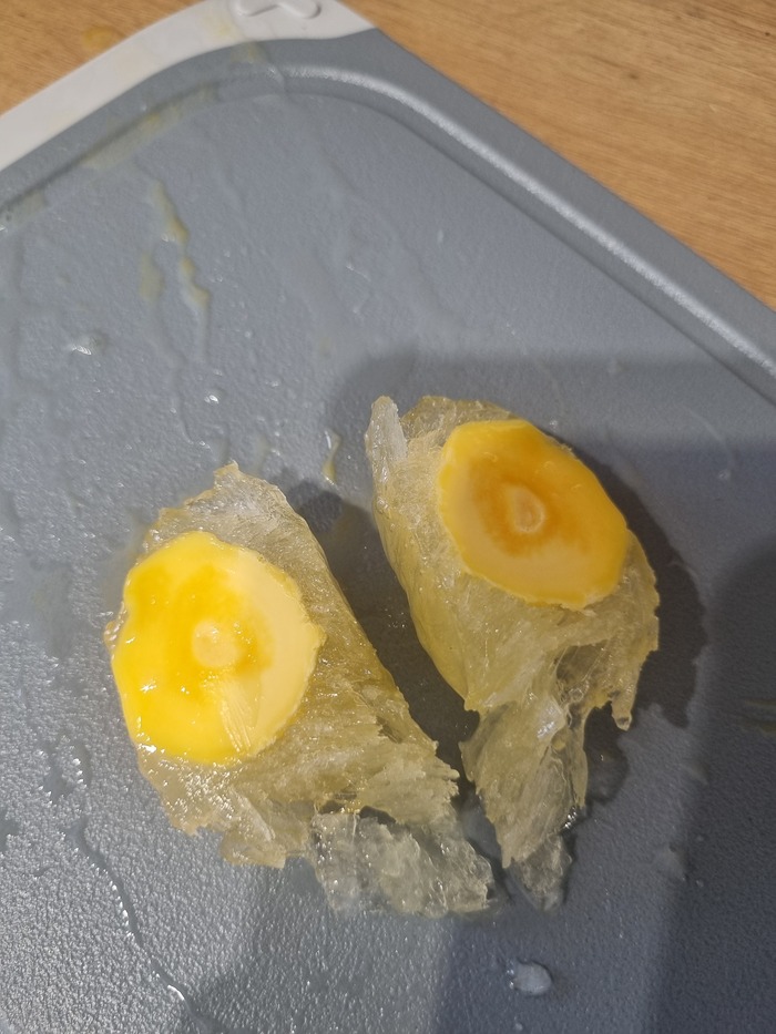 Потом достали, почистили, нарезали и в холодильник оттаивать до почти растаяло.