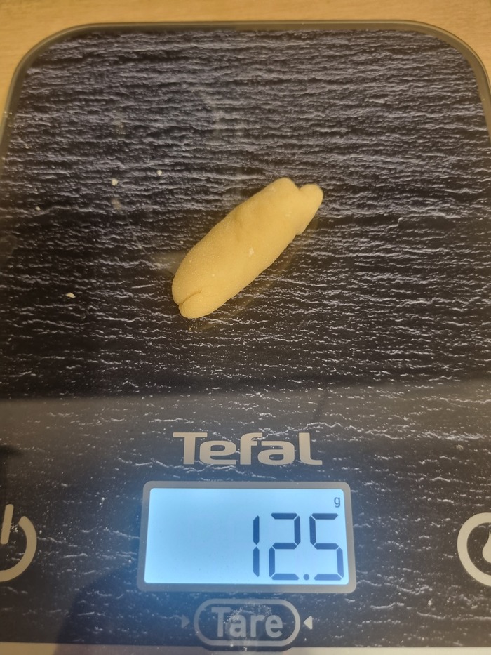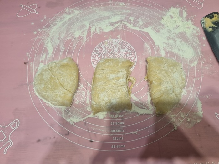 Два кусочка убрал в контейнер (можно просто под пленку). А оставшийся раскатал в колбаску.