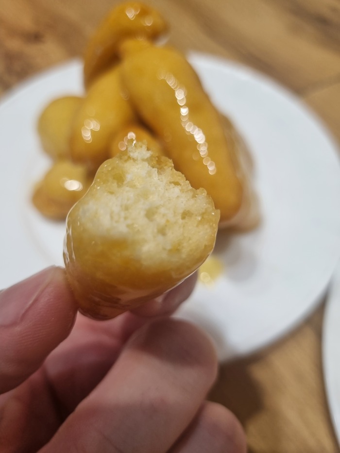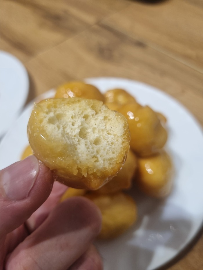 Смачиваем лопатку в воде, сверху поливаем сиропом наши баурсаки и аккуратно перемешиваем.