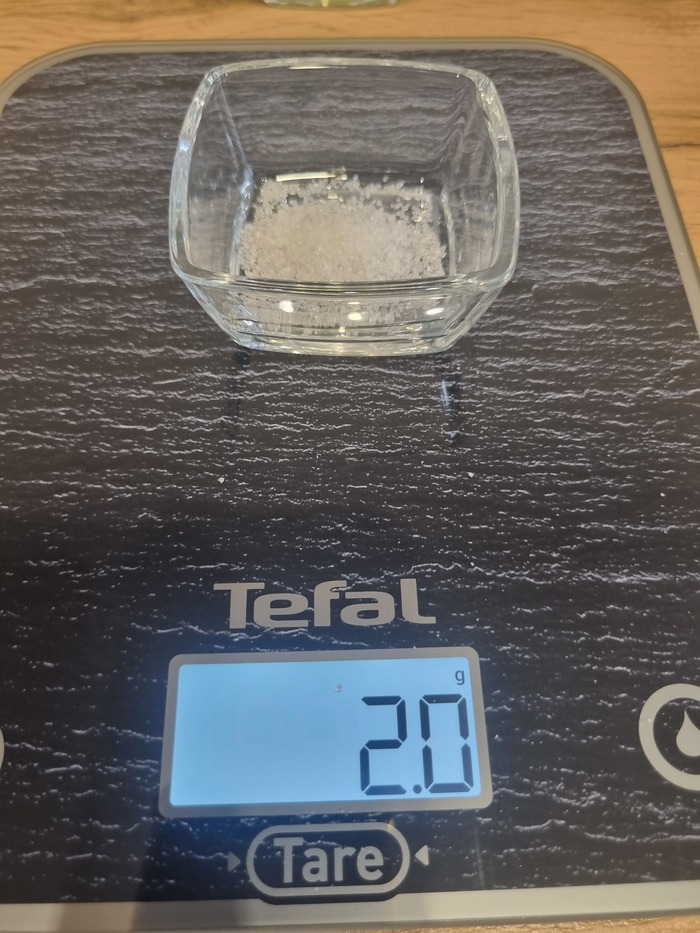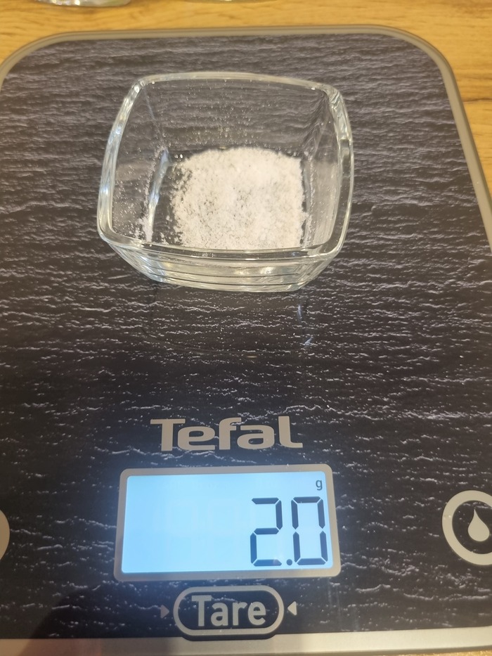 В неё же соль 2 грамма, сахар 2 грамма и разрыхлитель теста 4 грамма. Перемешиваем.
