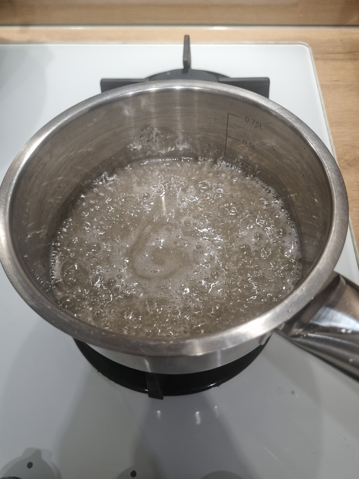 Сахар в сотейник, в него сразу воду и на огонь. Закипело - увариваем 3 минуты, добавляем мед. Кода мед полностью растворился - доводим до кипения и увариваем еще 1,5 минуты.
