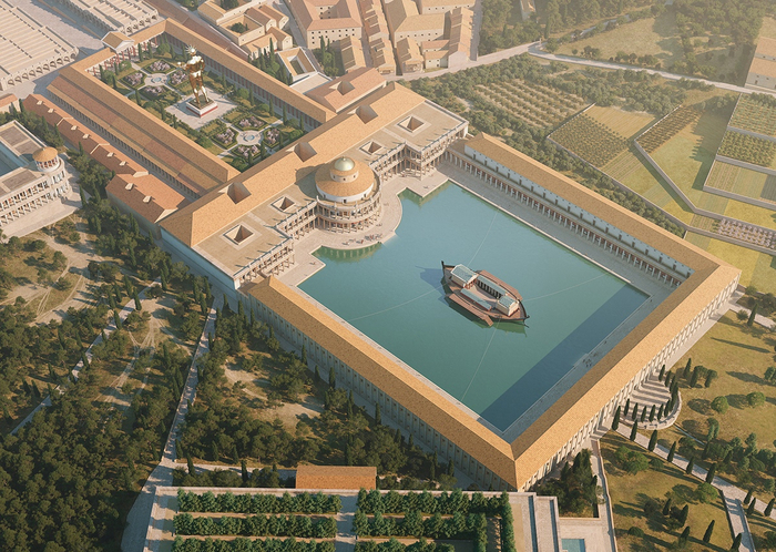 Больше всего средств он потратил на знаменитый Золотой дворец, тройной портик которого протянулся на милю (1,45 км). В подражание Востоку во внутренних покоях все было покрыто золотом, драгоценными камнями и раковинами с жемчужинами. В обеденных палатах потолки делали раздвижными, чтобы через отверстия рассыпать цветы и рассеивать благовония. Когда дворец был закончен, Нерон удовлетворенно сказал, что теперь, наконец, он будет жить по-человечески. До его самоубийства оставалось всего несколько лет.