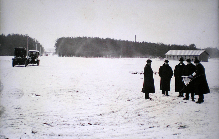 Сергей и Степан Рябушинские обсуждают план строительства АМО. Тюфелева роща, 1916 г.