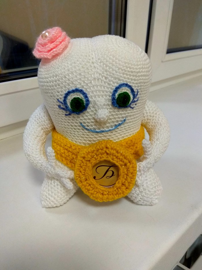 Этим летом в стоматологии, где я время от времени лечу зубы, сделали мне заказ. Попросили связать зуб. Я связала вот такой. Но то, что буква С сделана неправильно, я увидела тогда, когда уже отдала заказ. Стыдоба!